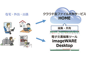 ドキュメントツール「imageWARE Desktop(イメージウェア デスクトップ)」を利用して、クラウドストレージサービス「HOME type-S2」に保存した文書の閲覧・編集・印刷を行うことができます。ファイル名編集などの基本的な操作に加え、PDFファイルにも注釈を付与し紙文書のような備忘録や伝達事項の記載を行うことで、電子化した紙文書を介してテレワークやモバイルワークの利用者との情報共有と利活用を推進します。