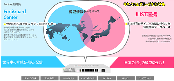 こうした課題に対応し、キヤノンMJとキヤノンS&Sはこのほど、フォーティネットジャパン社が提供するUTM「FortiGate」にラック社が提供する脅威情報データベース「JLIST」を組み込むことで、日本国内で流行するサイバー攻撃への防御を強化したFortiGate "SecuritySuite JL"の提供を開始します。