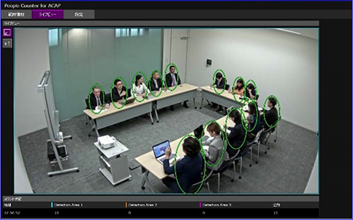 指定したエリア内の人数をカウント。推奨カウント人数は30人以下となります。AXIS社製のネットワークカメラ内部で人数をカウントするACAPアプリケーションです。