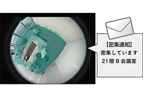会議室ごとの入室人数を設定し、その人数を超える数を検知した場合、スピーカーやパトライト、メールで通知します。スピーカーからの音は、お好みの音に設定する事も可能です。構成により、管理者や会議室予約者の複数名に対してメール通知によるアラートを発信することも可能です。