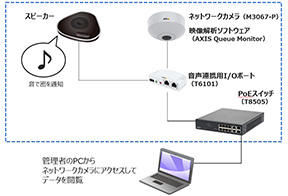 ネットワークカメラ×1台 ⁄ PoEスイッチ×1台 ⁄ IOボックス×1台 ⁄ スピーカー×1台 ⁄ 映像解析ソフトウエア×1ライセンスのパッケージです。