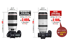 F4.5-5.6L IS II USM」(左)と「EOS R5」を装着