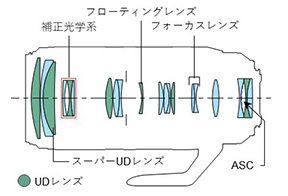 「UDレンズ」:「UD(Ultra low Dispersion=特殊低分散)ガラス」を用いたレンズ。「スーパーUDレンズ」:UDレンズの性能を大幅に向上させ、UDレンズ2枚分、蛍石の特性とほぼ同等の効果を備えたレンズ。