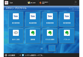業務で使用する定型帳票のスキャンデータにOCR(光学文字認識)処理を行い、抽出した複数のキーワードの組み合わせから、ファイル名やフォルダー名とともに保存先のフォルダーを設定し、帳票を自動で振り分け保存できる新しいファイリング方式です。本体の操作パネルに、部門や個人、帳票の種類、業務など使い方に合わせて事前登録したボタンを押下することにより、原稿を読み取り、事前に学習させておいた定型帳票と照合して帳票のレイアウトの特徴を特定し、ファイル名の付与、外部クラウドストレージ※2のフォルダーへの振り分け保存を自動で行います。レイアウトの特徴はひとつのボタンに最大1,000件登録できるため、オフィスの多くの帳票を認識し、電子ファイリングすることが可能です。また、ADF(自動原稿送り装置)は、異なるサイズの用紙をまとめて読み取りできるため※3、複数の帳票を手作業で仕分けずに一括で電子ファイリングすることが可能となり、効率的な電子化を実現します。