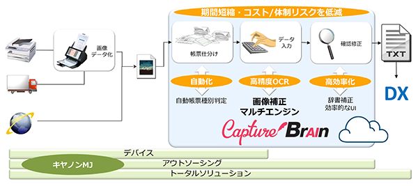 キヤノンマーケティングジャパン株式会社(代表取締役社長:坂田正弘、以下キヤノンMJ)とキヤノンITソリューションズ株式会社(代表取締役社長:金澤明、以下キヤノンITS)は、AI OCR基盤として“CaptureBrain(キャプチャーブレイン)”の機能とラインアップを拡充し、新バージョンの提供を2020年10月下旬より開始します。本ソリューションは紙帳票の電子化とデータ入力業務の自動化により、お客さまの業務プロセスを最適化し業務効率化を実現します。キヤノンMJグループは中小・中堅企業から大手企業まで業種・業務に特化したデジタルソリューションの提供を強化し、お客さまのバックオフィス業務のDXを支援していきます。