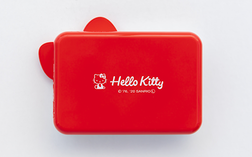 一般的なスマートフォンと同程度の手のひらサイズで手軽に持ち運べるので、場所を選ばずプリントを楽しむことができます。ハローキティの顔を再現したこだわりのデザインで、リボンと鼻は立体造形になっています。また、背面にもハローキティのロゴマークをあしらいました。