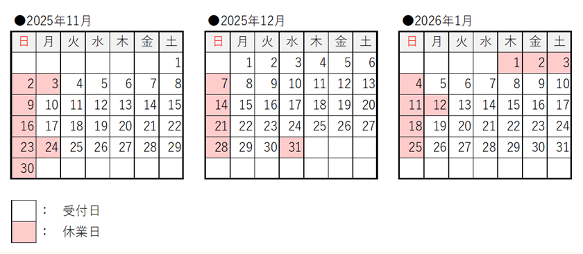 受付日カレンダーは毎月更新します。