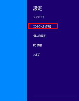 デスクトップ画面を表示し,マウスカーソルを画面の右下隅にあわせてから、マウスを上に移動させ、下記のチャームバーを表示し設定を選択します。