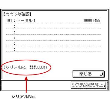 (1)操作パネル上のカウンタ確認キーを押し、タッチパネルディスプレイにシリアルNo.を表示させます。