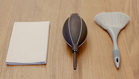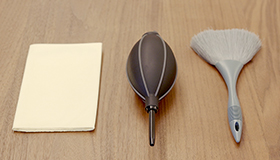 クリーニングクロス、ブロアー、ブラシを使用します。