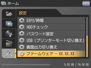 メディアストレージ M80の「+字」キーを操作して、[設定] -> [ファームウエア - 02.05.03]を選択します。