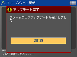 「アップデート完了」の表示が出たら、ファームウエアアップデート完了です。